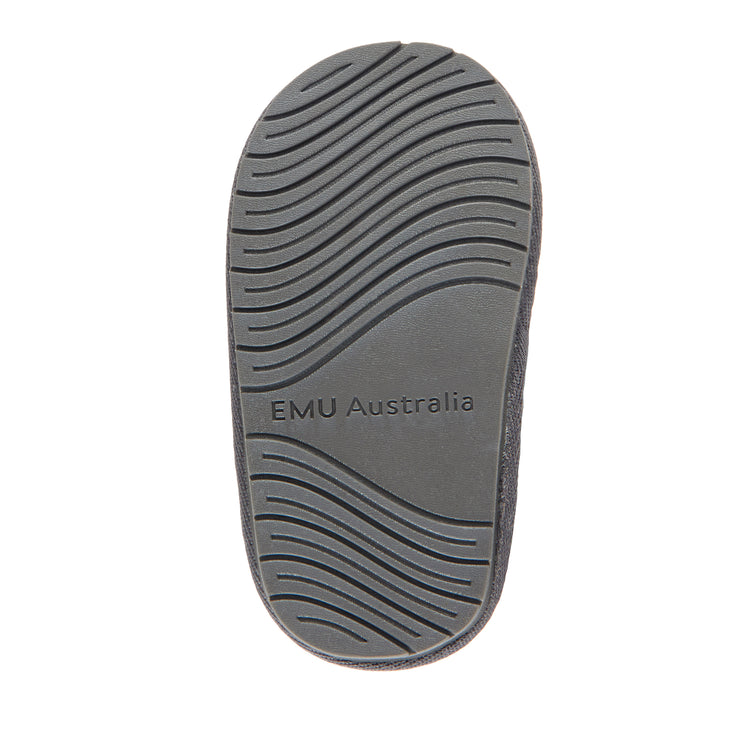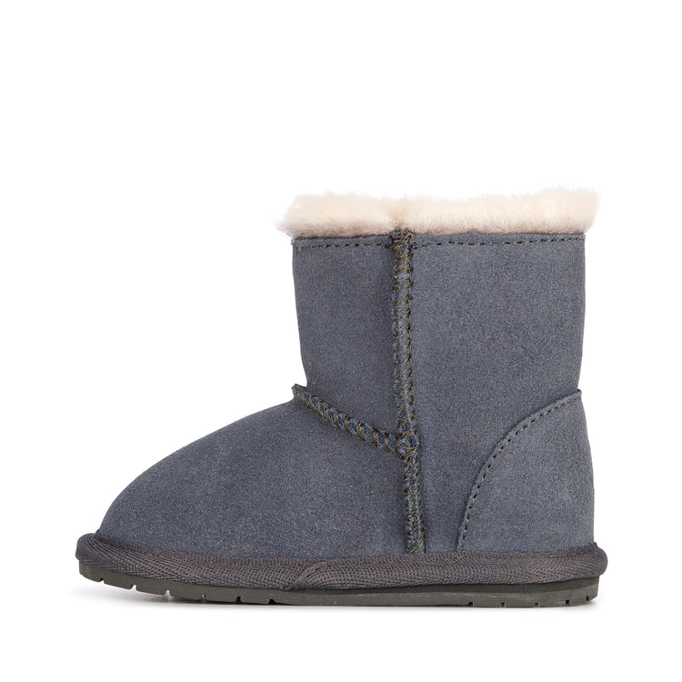 The EMU Australia Toddler Boots in Charcoal is for those taking their first steps, the Toddler is a soft suede toddler boot lined with cosy Australian Merino wool to keep feet perfectly warm and snug. Built on a flexible moulded rubber sole for grip and traction, it features a full velcro closure for a snug and easy fit.