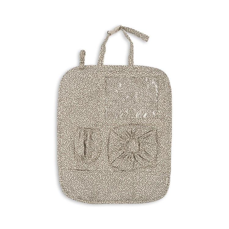 The Konges Sløjd car organiser is a portable and easy to carry storage solution perfect for everyday use. Features an adjustable strap that attaches to the car headrest and car seat, compartments for a tablet, various sized pockets, and a elasticized strap with velcro closure to hang an activity toy or pacifier case.