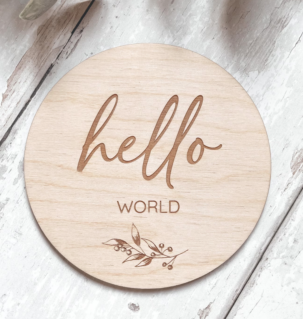 Hello World Wooden Disc | Wooden Baby Announcement | Baby Arrival Sign | Social Media Flat Lay Prop | Laser Engraved | UK