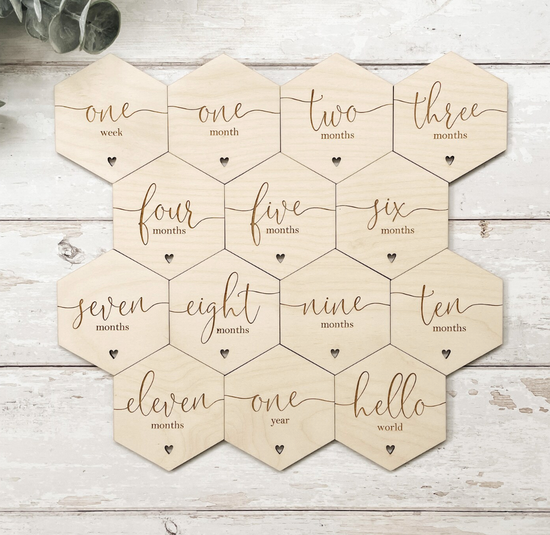 Hexagon Baby Milestone Discs | Wooden Baby Milestone Markers | Laser Engraved and Cut | Social Media Flat Lay Prop
