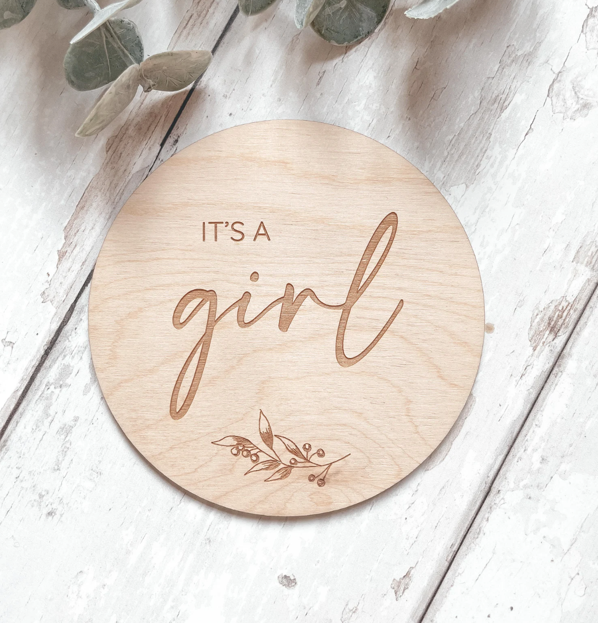 Our 'It's a Girls' disc is the sweetest accessory for a gender reveal or baby shower. Featuring a beautiful leaf design, these make the loveliest flatlay props - perfect for those photo's shared with family and friends or Instagram.