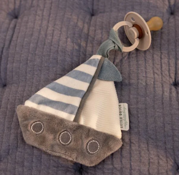 Comfort is coming. Opt for this captivating pacifier cloth and you’ll have your baby’s soother always within reach. It makes for a great maternity gift too. Attach a teether or pacifier to the blue-hued cotton loop to keep it clean and close by. Shaped into a little boat, it doubles as a fun cuddle toy to play and snuggle up with at bedtime. Pair with our matching Sailors Bay products for a coordinated nursery.