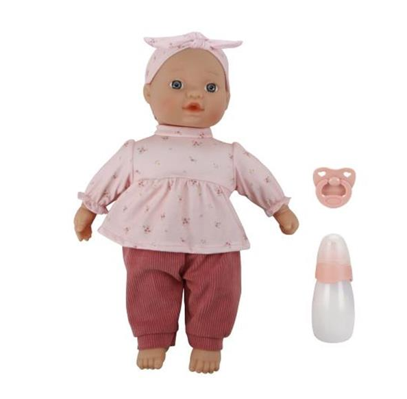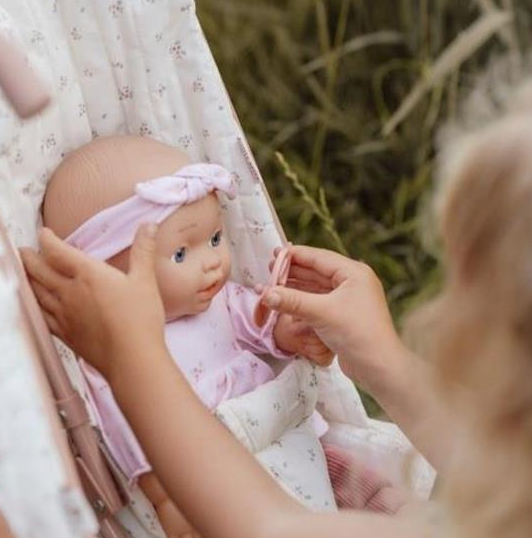 Lily is an adorable and lifelike doll, with a soft and cuddly body, that loves to be loved. You can change her clothes, help her go to sleep, and calm her down with the pacifier. When she’s hungry, offer her the milk bottle. Children love to mimic everything their parents do, and this baby doll will inspire your little one to engage in nurturing and caregiving role-play. Lily wears a hairband, long-sleeved dress in the Rosy Meadows design, styled with pink ribbed pants. Changing her clothes promotes fine motor skills, and the pacifier and milk bottle add an element of interactive play.