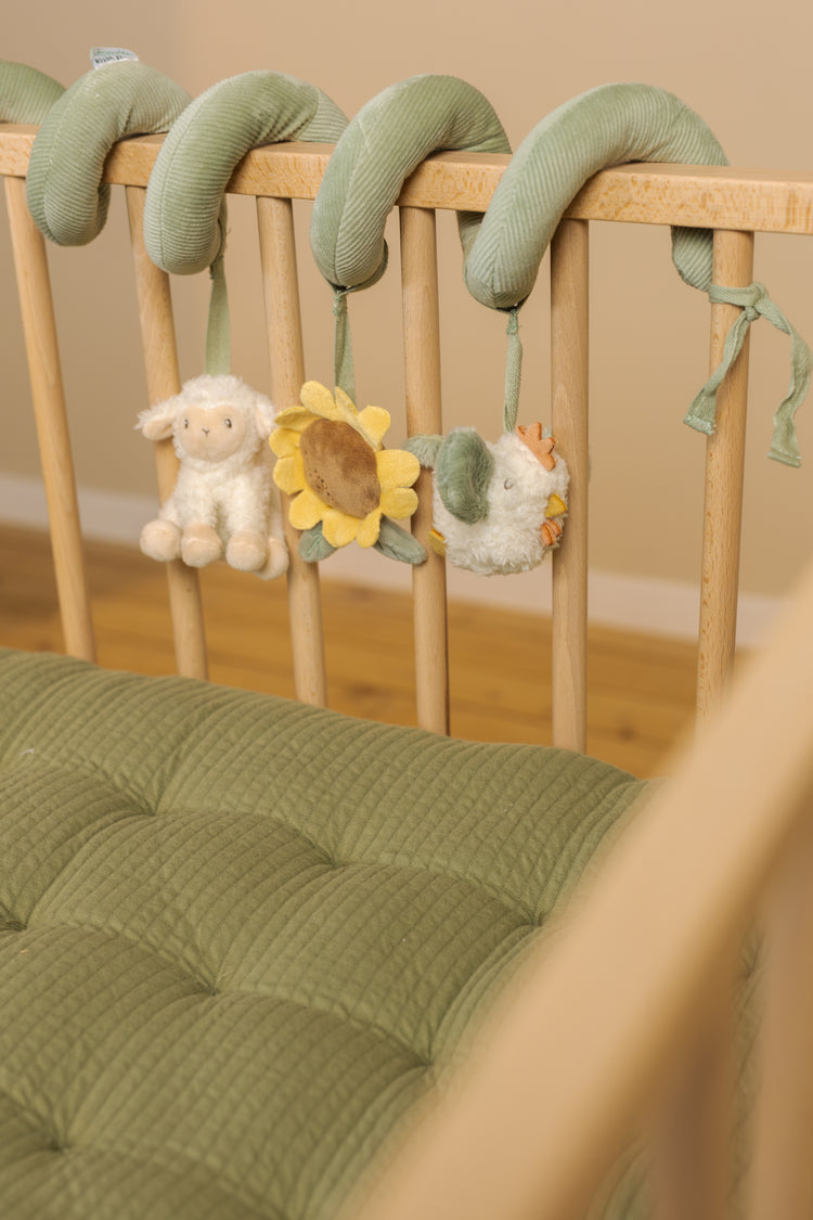 Look, feel, and discover! This fun and entertaining activity spiral will keep babies busy both at home and on the go. Easily attach this practical toy to anything from a crib to a playpen or car seat. It strengthens the senses and stimulates hand-eye coordination. The activity spiral is made of corduroy with cotton and features a small sheep, a cheerful chicken, and a beautiful sunflower.