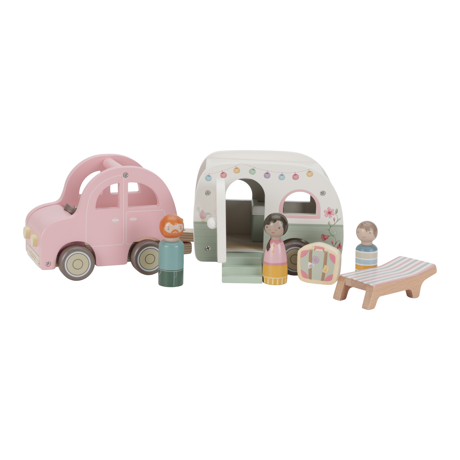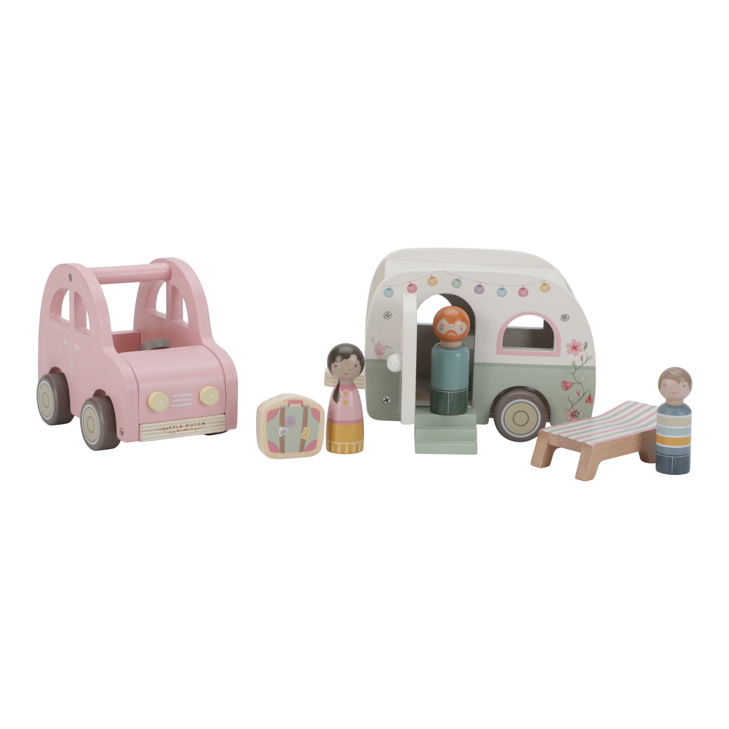 Pack your dreams and let’s hit the road! Discover the adventurous world with the cute pink car and caravan. Set up camp wherever you want and enjoy the freedom of a moving holiday home. Whether it’s the living room, the playroom, or the kitchen, take out the beach chair, unpack, and let the 3 peg dolls enjoy the surroundings.