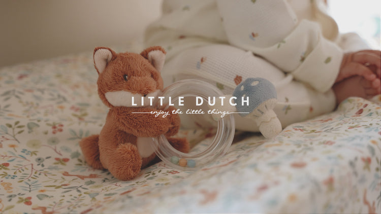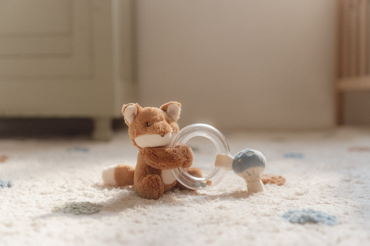 Grasp, turn and shake! The lovely fox with his soft fur and little tail, invites you to play and set this rattle ring in motion. He also picked a little mushroom for you to cuddle with. The transparent ring contains 3 colourful little beads that start rattling when your baby plays with this fun toy. Not only does the rattle ring ignite your baby’s curiosity and senses, but it also enhances hand-eye coordination.