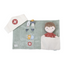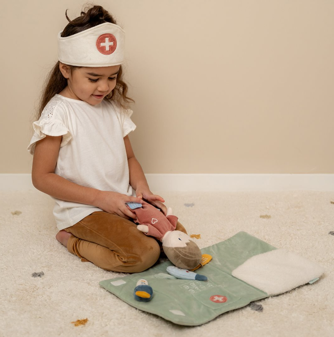 This doll care playset will encourage lots of hours of play pretend. The soft olive green suitcase folds open into a hospital bed and carries the basic essentials to treat a patient. Your little one can put Jim in his pyjamas, check his temperature with the thermometer, use the syringe to make him feel better and treat a wound with band aids. When it’s Jim’s turn to play nurse, he will put on his nursing cap and care for all the cuddly toys that need a doctor.