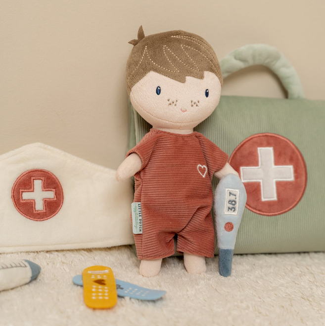 Doctor, Jim needs your care! Look at him in his pjs, he can’t wait to play nurse together. You can find all you need to care for him in his suitcase. First measure the patient’s temperature. Is a band aid enough to ease the pain? Which cuddly toy will be your next patient? Nurse Jim loves to help and is always by your side to care, play and cuddle.