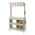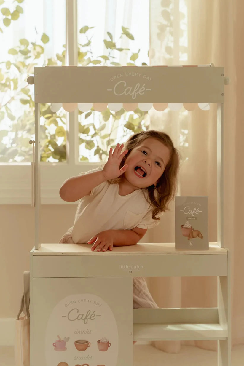 Welcome to the market! With this beautiful wooden market stall, children can play their own shop. The fabric canopy gives an authentic market atmosphere and with the chalkboard and illustrated cards, they can beautifully display the products. The set also includes a shopping bag and crates for a real shopping experience. Turn the market stall around and it becomes a café, complete with a menu and cheerful illustrations. Combine with the cash register, scale, or tiered stand with pastries for even more play fun.