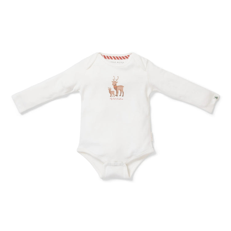 Your very first Christmas! A wonderful new world of sights, sounds and experiences filled with holiday cheer. This cute little body will keep you warm during the winter season. Layer with a cardigan or jacket and you are ready to celebrate Christmas. A perfect unisex look for your newborns first Christmas. The comfortable bodysuit is made from certified organic cotton and features long sleeves and a snap button crotch.
