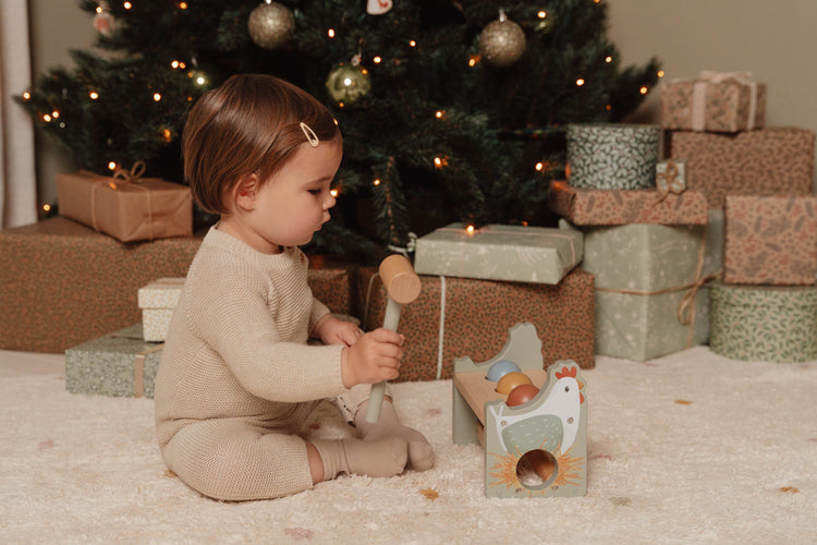 Tik tik tik! Make the chicken lay an egg by hitting the 3 balls in the wooden hammer bench with the hammer. This is a good exercise for your child's motor skills. Have all the balls been hit in? Put the balls back and start again. They will be busy with this for a while!