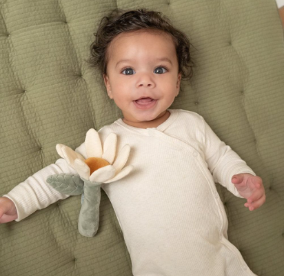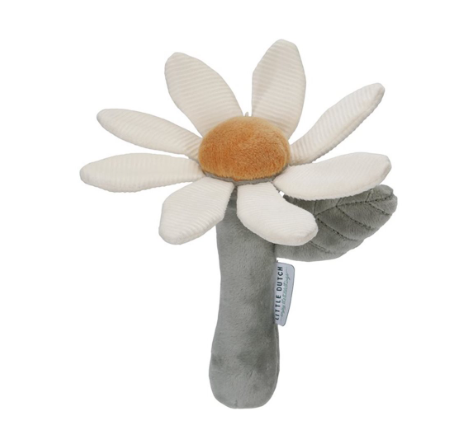 How cute is this rattle in the shape of a flower from the Little Farm collection! When you play with it, you can hear a pleasant sound. There is a hidden crinkle in the flower's petals for extra fun. The rattle stimulates hand-eye coordination, is made of wonderfully soft material, and can be easily grasped by little hands.