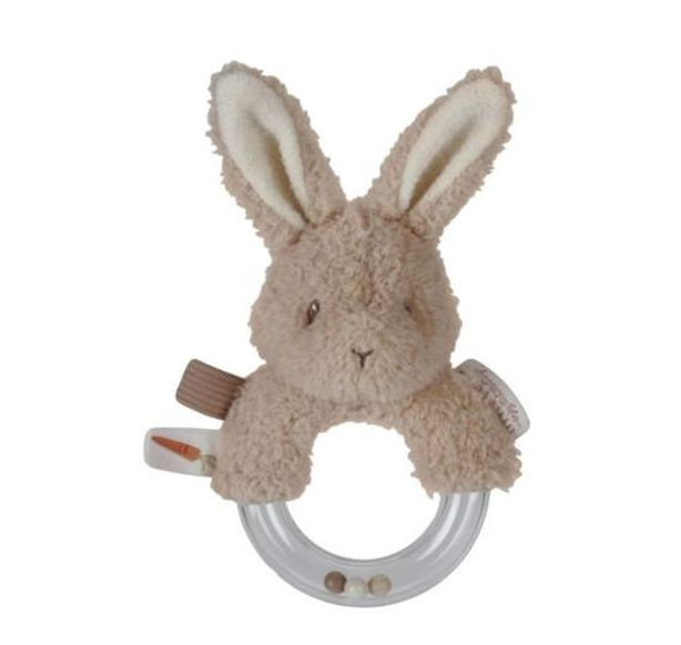 Grab, twist and shake. This ring rattle from the Baby Bunny collection in the shape of a bunny will pique your baby's curiosity. Play with her ears or rub her soft fur. The transparent ring is filled with small beads that rattle when your baby plays with it. This attractive baby toy improves hand-eye coordination and stimulates the senses.