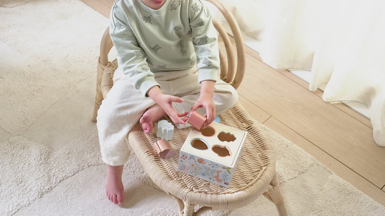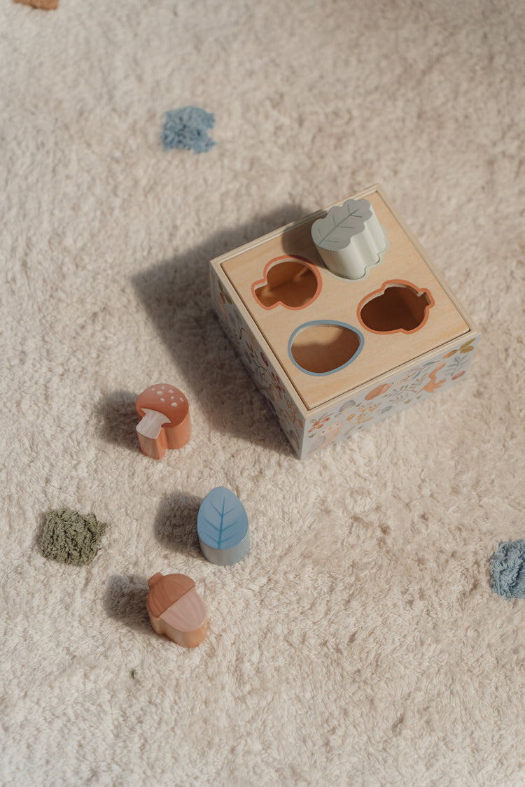 Find the opening that matches the shape of the mushroom! And where do the acorn and leaves go? This wooden shape sorter is a creative sorting game that teaches your little one to recognise and match shapes and colours, and fine-tunes hand-eye coordination. The box is made of sturdy wood and illustrated with a lovely scene from Forest Friends. The shapes are designed for little hands to easily grasp and push through the correct opening. This classic toy is both educational and fun at the same time!