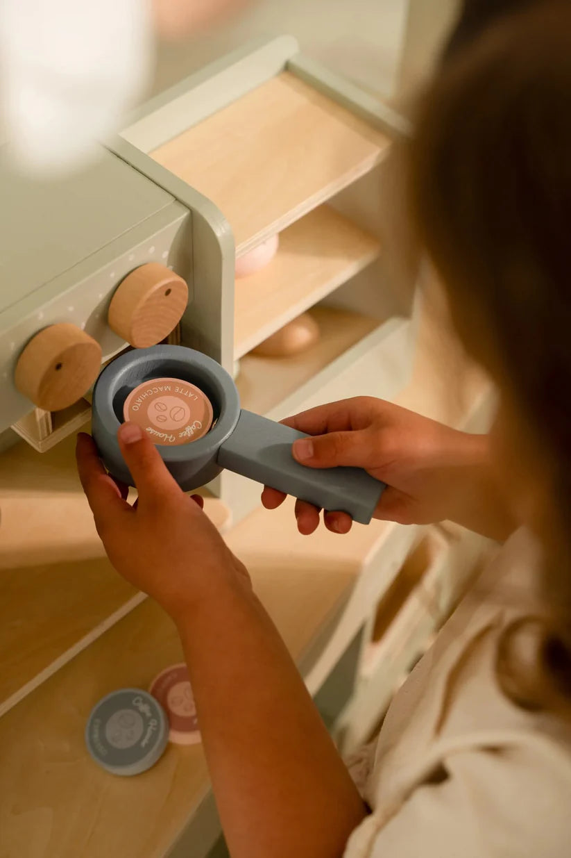 Coffee or tea? Would you like a cookie or cake to go? With this lovely wooden toy set you instantly have a place to play house or play shop. Become a true barista and make your mum and dad a nice cup of cappuccino with your own coffee maker. Or serve tables in your own little coffee shop with a menu filled with delicious treats.
