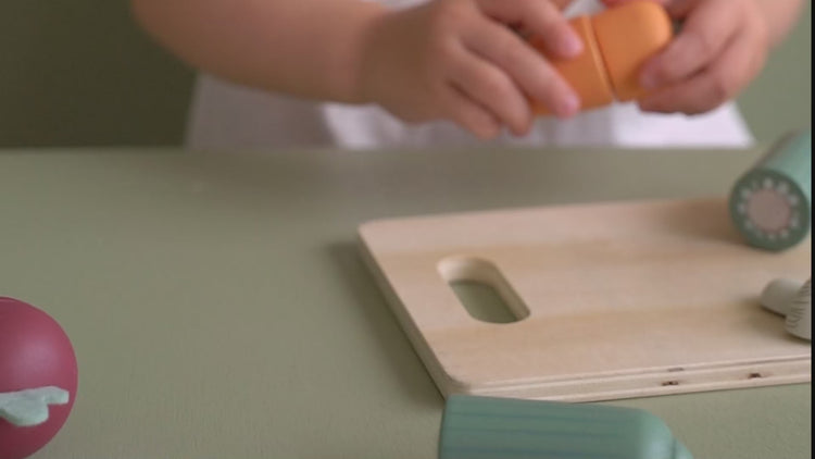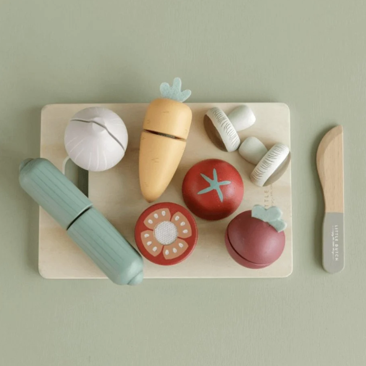 Eat your veggies! This set of wooden vegetables is a playful way to stimulate role playing by your child. Cooking a meal is so much more fun together. Slice the veggies with the wooden knife and cutting board included and become a top chef!