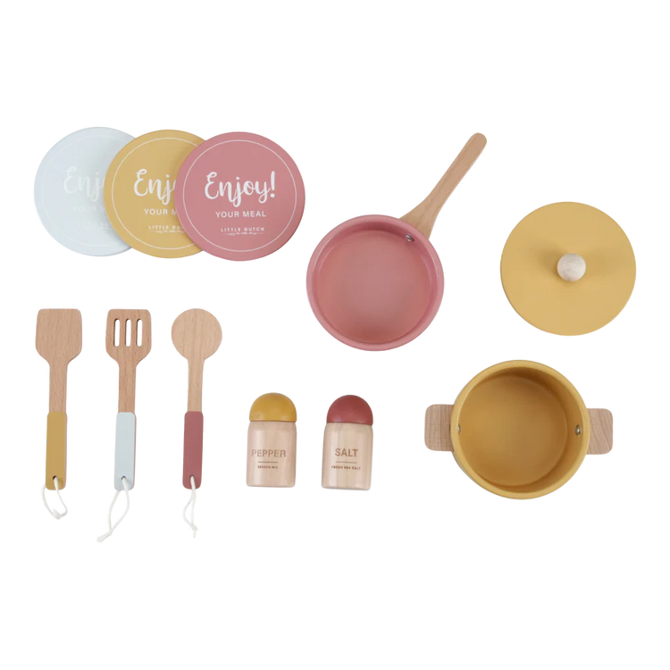 What's cooking little chef? Prepare the tastiest dishes in this adorable wooden kitchen. Treat your family or your favourite dolls and cuddly toys with a home cooked meal. With the two pans and kitchenware you are set to become a master chef! The kitchen offers everything you can imagine. You can bake a pie in the oven, cook some veggies on the stove and, not to forget, wash your hands in the sink. There's even a salt and pepper set and a cabinet to store your groceries.