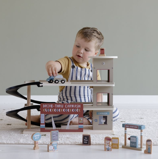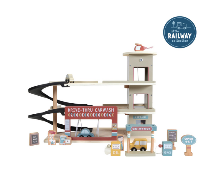 Stop by the garage to fill up on gas, park your car or get it cleaned in the carwash. The expansion includes a garage with car wash, cars, helicopter, gas station, pumps, signs and employees. The wooden garage is one of the many playsets that can be connected to the Little Dutch railway set. The garage includes a helicopter platform and the wooden figurines and elements all have detailed illustrations on both sides. Complete the garage with the railway train XXL set and additional extension sets for hours of fun play.
