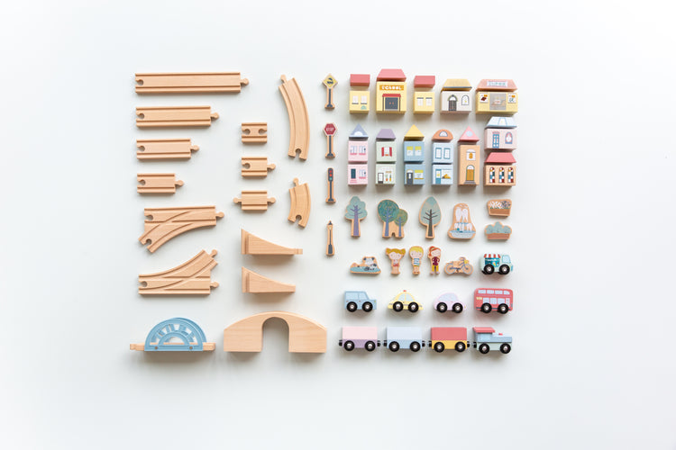 Go on endless adventures with the Little Dutch wooden railway track. Hop on board the train, the bus, the taxi or the car and explore the town. With more than 100 parts, this set offers many options to get creative and build new combinations over and over again. Features a locomotive with three cars, straight rails, curves, a bridge, various buildings, cars, people, trees, flower boxes, road signs, lamp post, traffic light, bus, ice cream truck, dog and a bicycle. Each of the wooden figurines and elements has detailed illustrations on both sides. Additional playsets, such as vehicles, a fire station and a garage are available for even more hours of fun play.