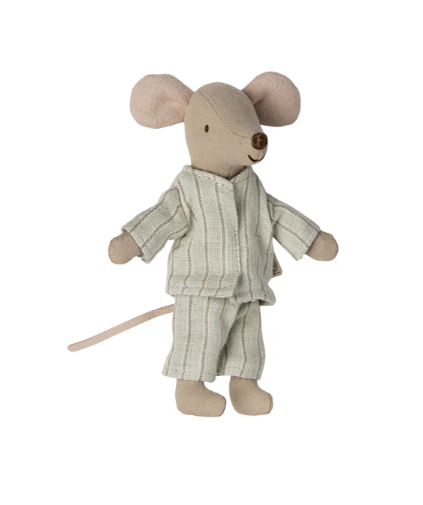 A classic Maileg item. This mouse is ready for hours of play and sleeps tight in the little matchbox. The clothes and bedlinen are made of soft fabrics with unique prints in beautiful colours.