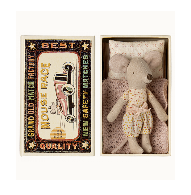 A classic Maileg item. This mouse is ready for hours of play and sleeps tight in the little matchbox. The clothes and bedlinen are made of soft fabrics with unique prints in beautiful colours.
