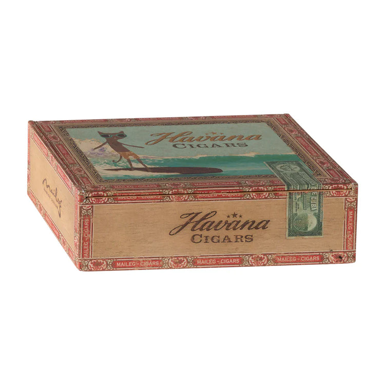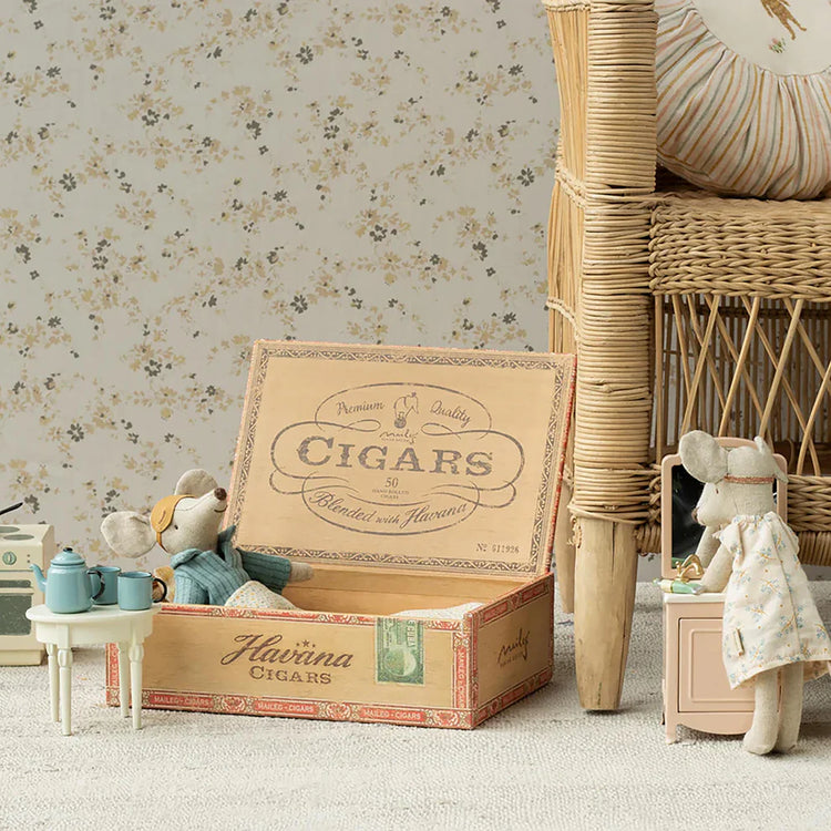 A classic Maileg item. Mom and Dad mice are wearing their beautiful nightwear and eye masks. The cigar box is a perfect bed for a good night's sleep and sweet dreams. Bed linen may vary in colour.