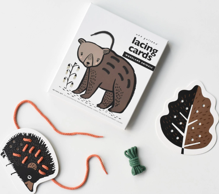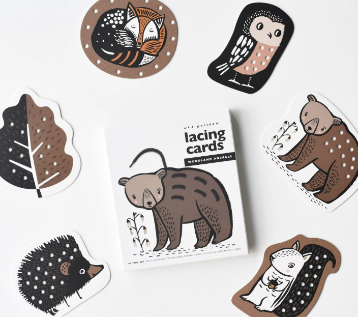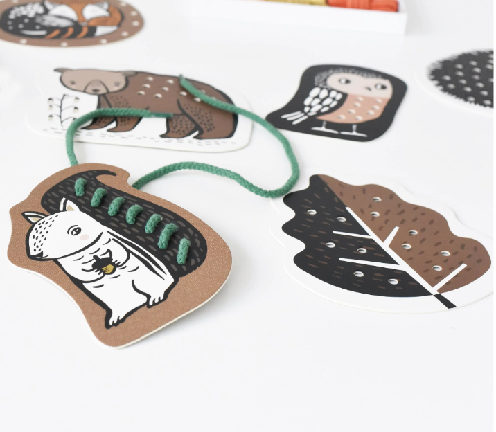 Dress up these adorable woodland animals in colour with our fun and educational Lacing Cards featuring Wee Gallery's signature hand illustrated characters. These six sturdy and durable Lacing Cards encourage hand-eye coordination and develop motor skills, colour identification, dexterity and an acute fashion sense! Printed on thick, sturdy board, they are perfect for little hands.