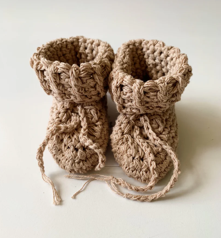 Made from a lovely soft 100% organic cotton yarn, with matching cotton tie. These booties are a classic and simple design as well as comfortable and machine washable at 30 degrees.