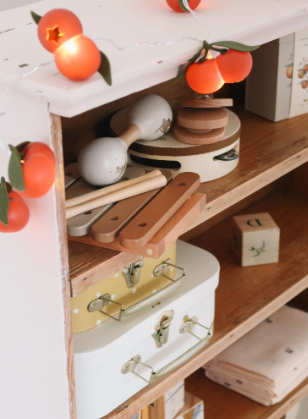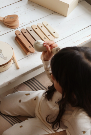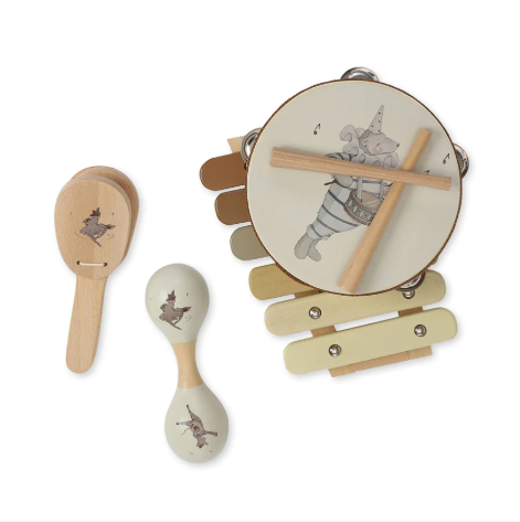 Set of music instruments, including tambourine, castanet, maracas and xylophone with drumsticks. The instruments come in a cute little suitcase.