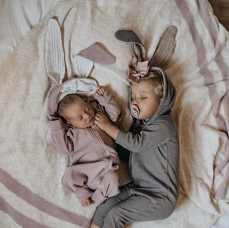 The cutest bunny sleepsuits. Adorable dangling ears are a signature Bunny design of Mama Siesta so here is the sleepsuit, breathable, warm and sweat-proof with soft layers throughout. It has a cuffed zip so it wont catch on any little feet or ankles. The breathable organic cotton allows a snuggle sleep and non-friction material allows crawling and playing.