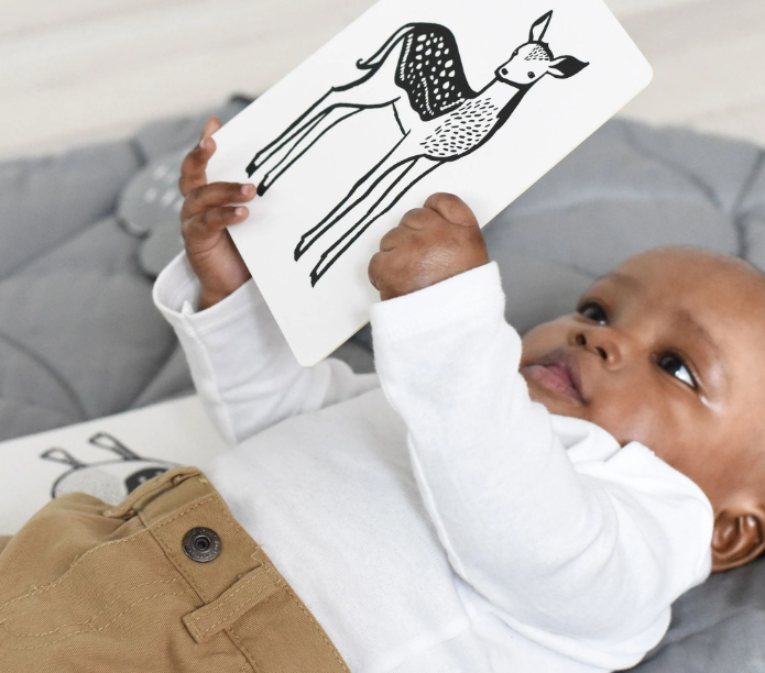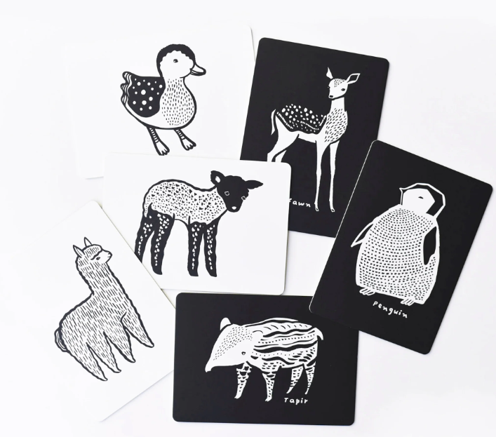 Babies are fascinated with black-and-white designs. Right from the start, these art cards begin developing a baby's visual perception. The six adorable animals in this set include Alpaca, Duckling, Fawn, Penguin, Tapir, and Lamb. Printed on sturdy board, these cards will stand up to baby's explorations.