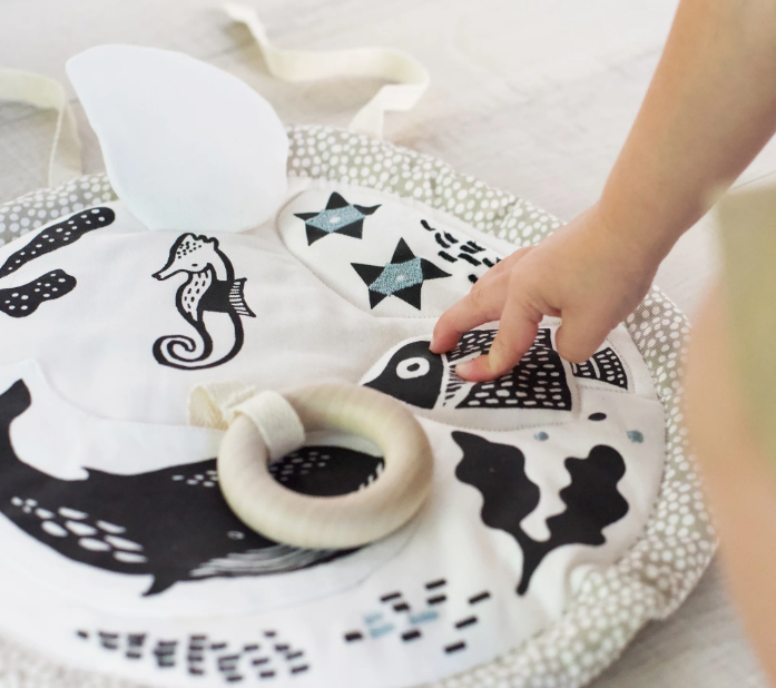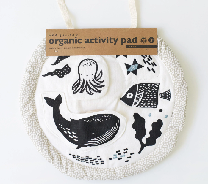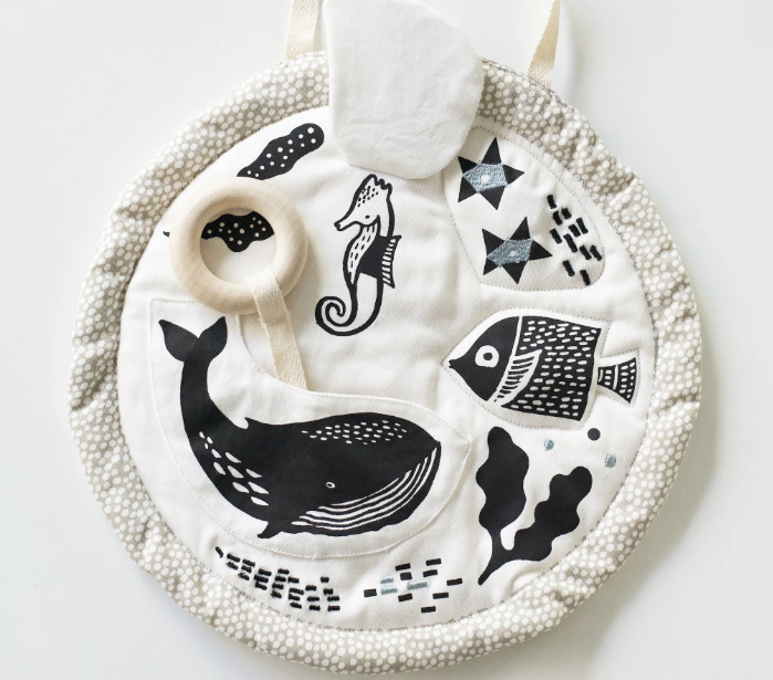 The Ocean Activity Pad keeps your baby stimulated with a variety of sensory stimulation from high contrast graphics, and hidden items including crinkly features, a rattle, a squeak and a maple wood teething ring hidden behind the Whale.