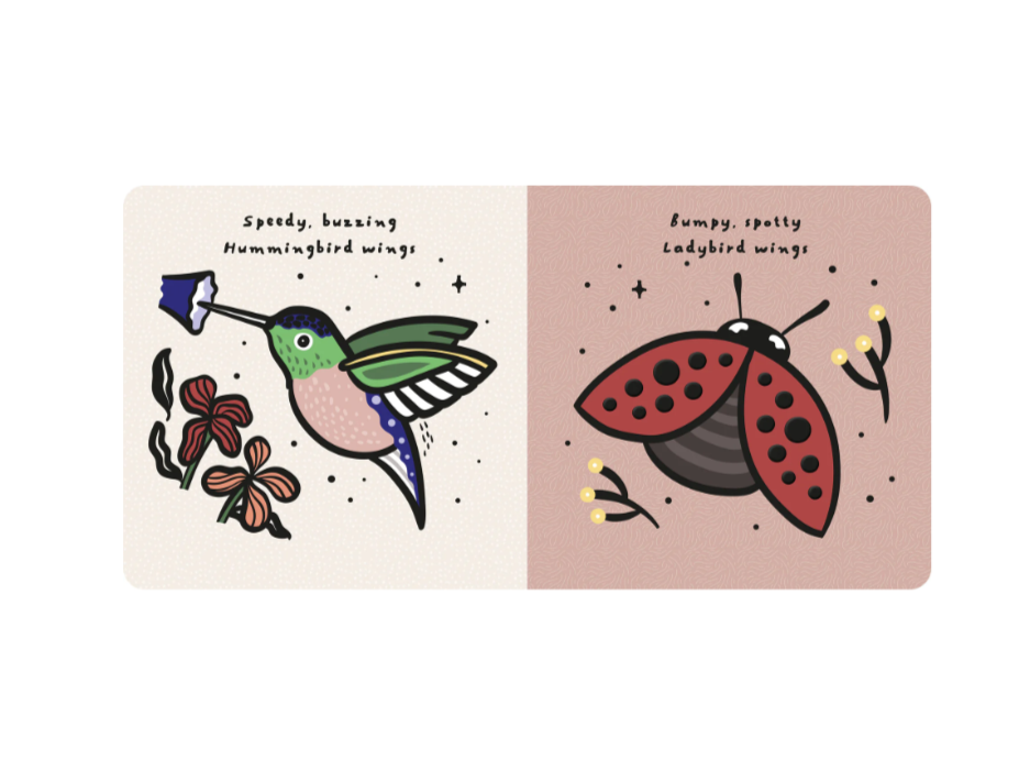 Meet seven stunning creatures who all feature wonderful wings! Little ones will love feeling the different textures and materials, whether it be the glittery, sparkling dragonfly wings or the fluffy pink wings of a swooping flamingo.