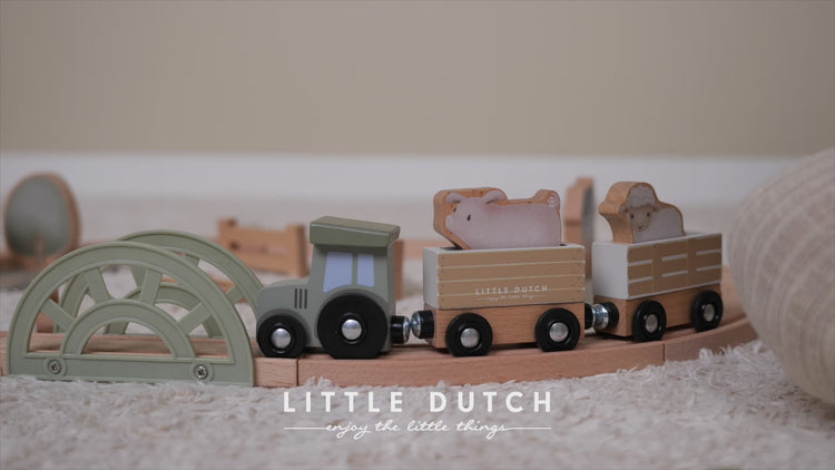 Honk honk! Go on endless adventures with this wooden train track from the Little Farm collection. Hop on the train and head to the farm with all the animals. What a cozy trip! Each wooden figure is illustrated in detail on both sides.