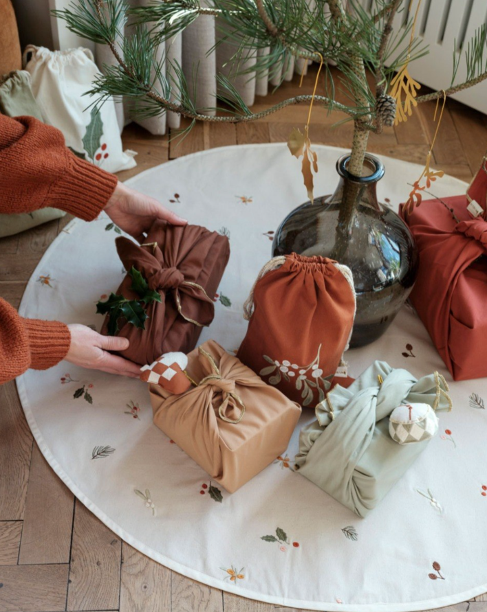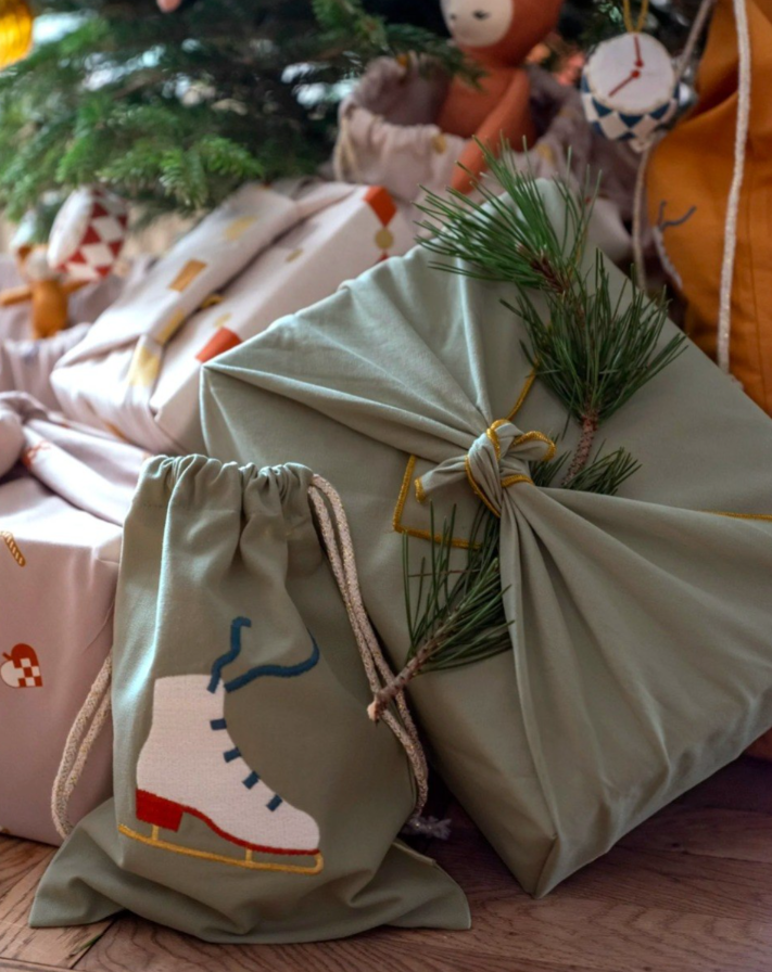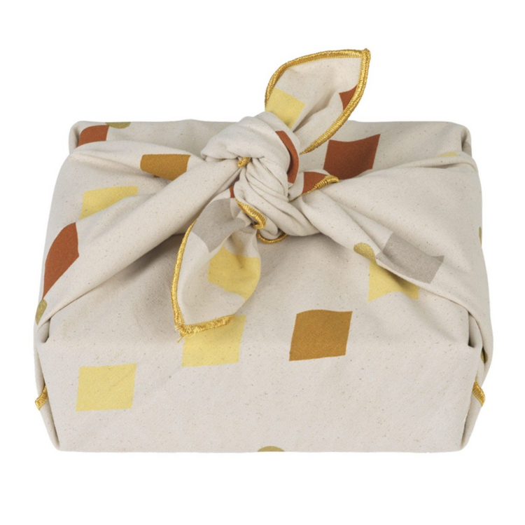 Sustainable, reusable and totally plastic free, this pack of two fabric gift wraps come in two square sizes. The smaller of the two is a grey-green with a golden embroidered border, while the larger one has a lovely diamond pattern in warm earthy tones with a gold embroidered border. This is a great zero-waste alternative to traditional wrapping paper and can be used over and over again. Presents look spectacular wrapped in the Japanese Furoshiki style, and this fabric gift wrap adds a luxurious touch to your wrapping. Use for Christmas or all-year-round gifting, this gorgeous Scandinavian design lends itself to any occasion.