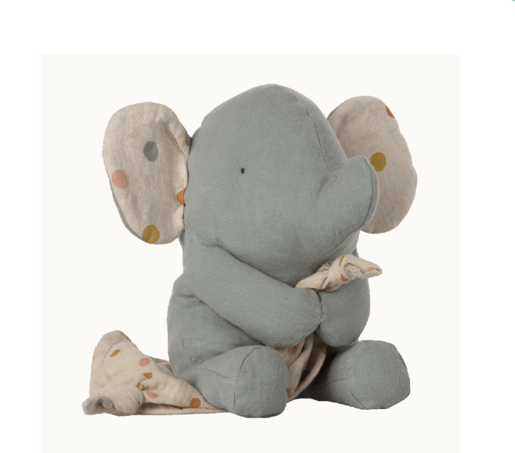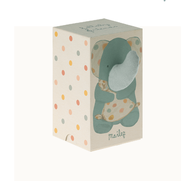 Maileg's Lullaby friends is a collection of beautiful items for babies. This elephant has a soft cuddle cloth and will play a calm lullaby when you pull the tail. It is made in soft fabrics with unique prints and packed in a beautiful gift box.