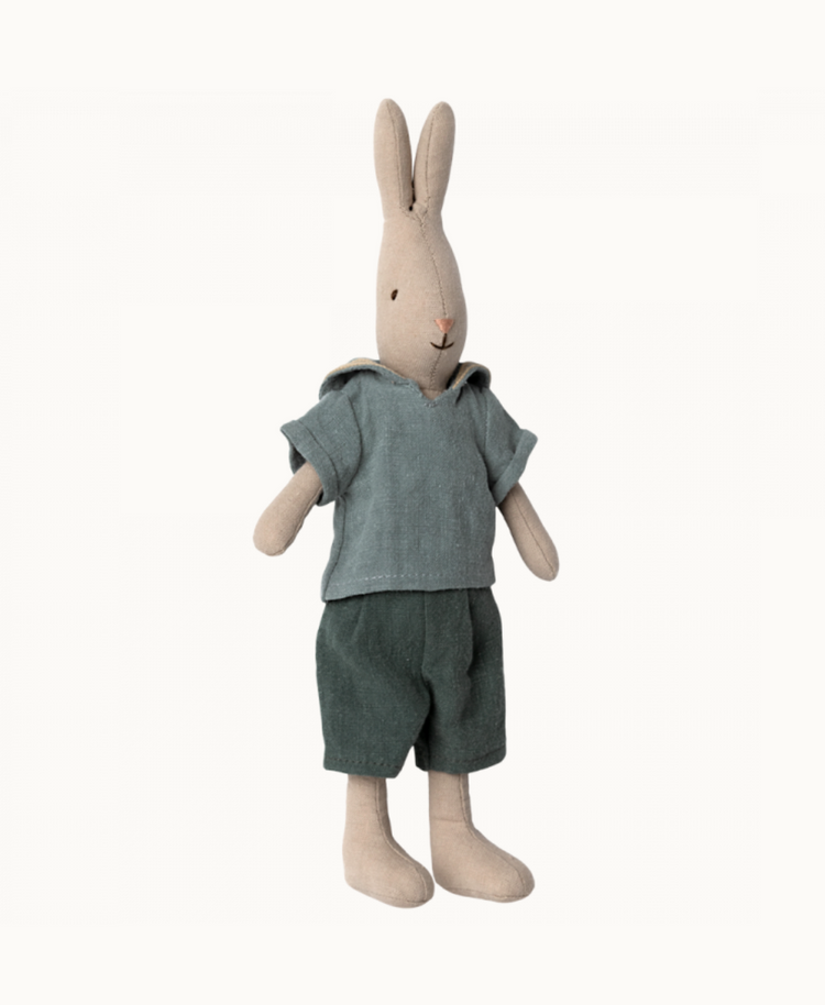 A classic rabbit made of soft natural linen and cotton fabric that gives a lovely hand feel and look. Size 2 rabbits fit into the Maileg dollhouse and all furniture size Mini. Buy loose clothes separately to expand the rabbit's wardrobe.