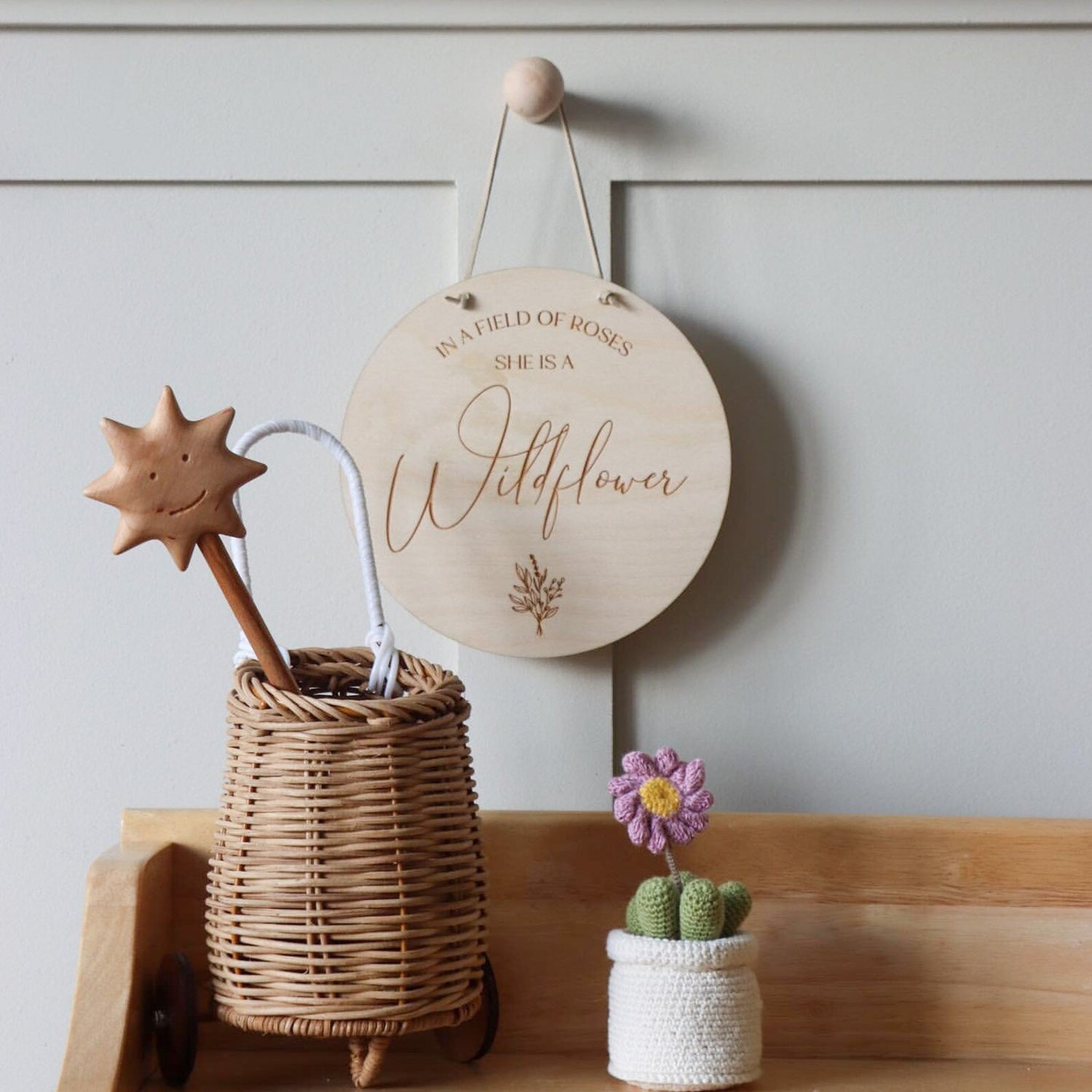 A beautiful wooden hanging featuring a wildflower design - perfect for your little ones playroom or nursery.